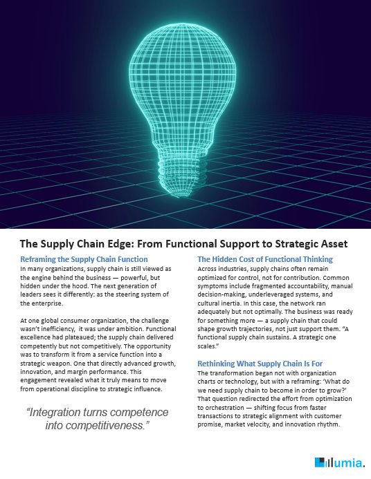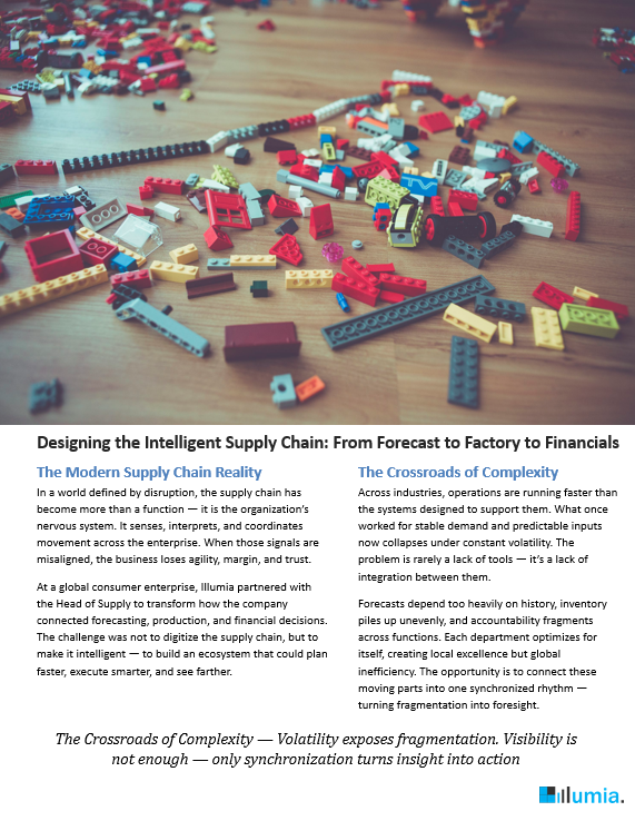 In today’s volatile landscape, supply chain performance defines business resilience. Illumia partnered with the Head of Supply at a global enterprise to move beyond digitization — designing an intelligent, connected ecosystem that unites forecasting, production, and financial decisions to plan faster, execute smarter, and operate with foresight.