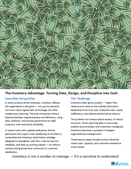 A global supply chain organization was carrying excess inventory that constrained cash flow and masked operational inefficiencies. See how Illumia partnered with its leadership to redesign planning, data, and governance systems — freeing working capital, improving service reliability, and turning inventory management into a strategic lever for supply chain performance.