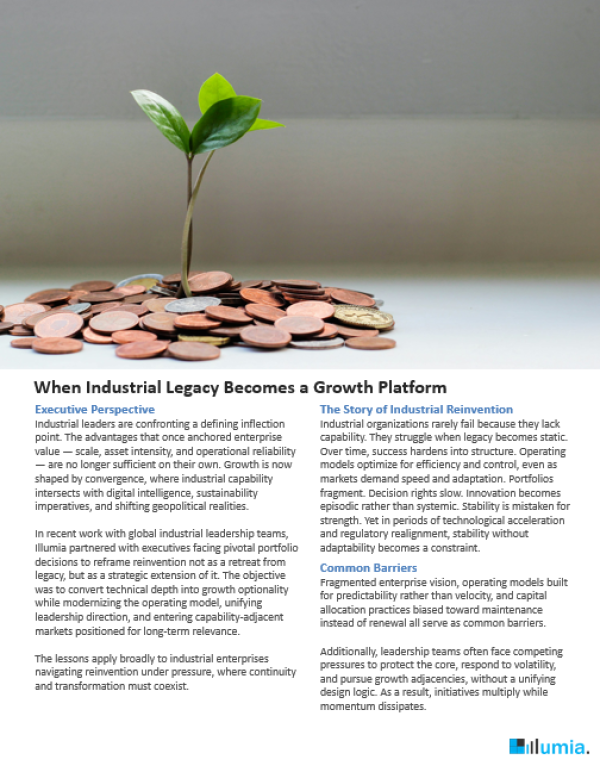 Illumia partnered with executives facing pivotal portfolio decisions to reframe reinvention not as a retreat from legacy, but as a strategic extension of it. The objective was to convert technical depth into growth optionality while modernizing the operating model, unifying leadership direction, and entering capability-adjacent markets positioned for long-term relevance.